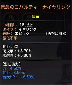 そしてリングはマンティコアでいじれないので、唯一知恵バイオだったイヤリングアクセを、信念のコバルティーナイヤリングへ変更。